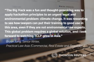 Clissmann: Aside from sponsoring last year and this year’s hackathon, Thomson Reuters has invested a significant amount of editorial time – over 600 hours in the last year and a half – participating in both hackathons, joining the drafting teams and helping to peer review TCLP’s Climate Contract Playbook containing the model clauses.